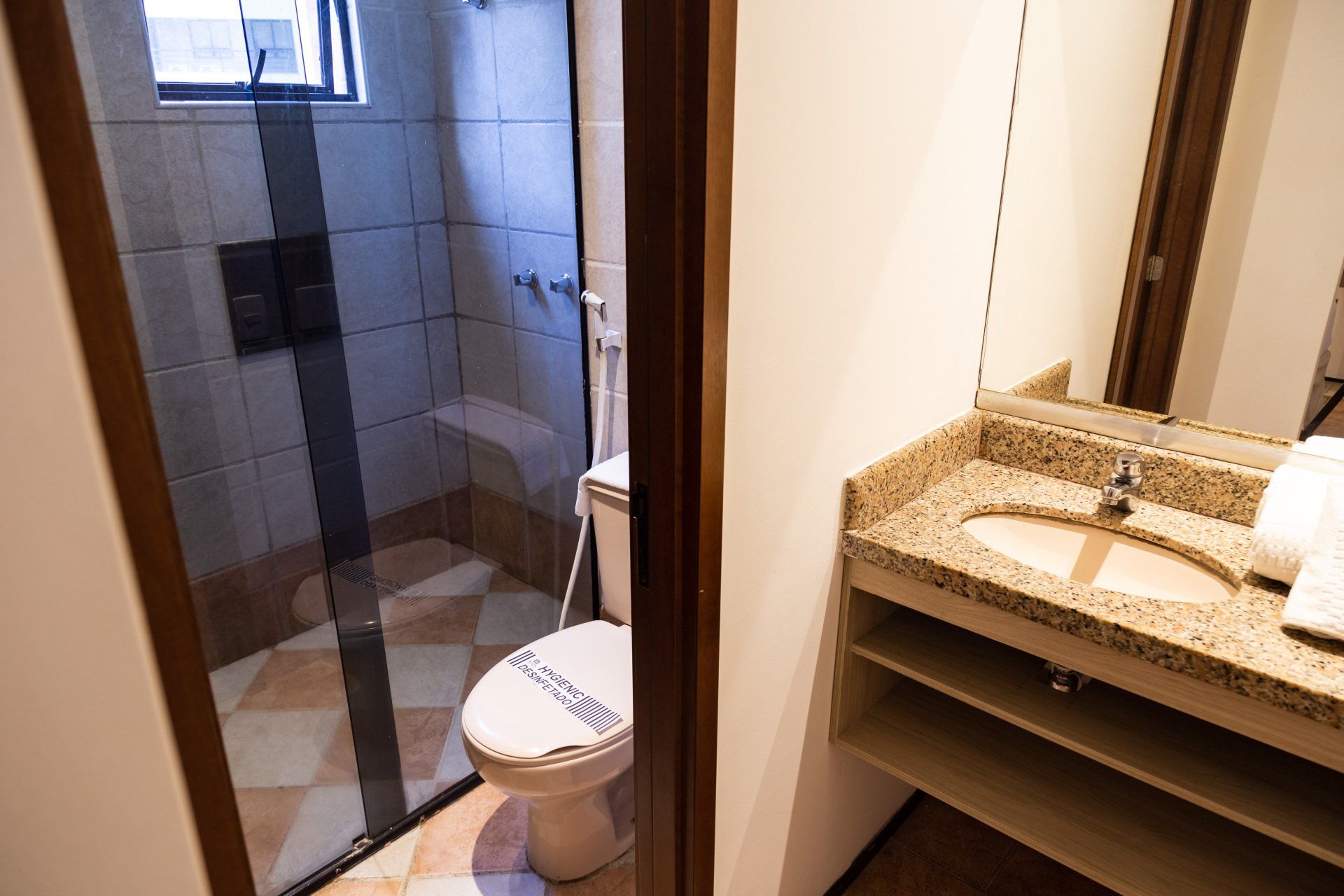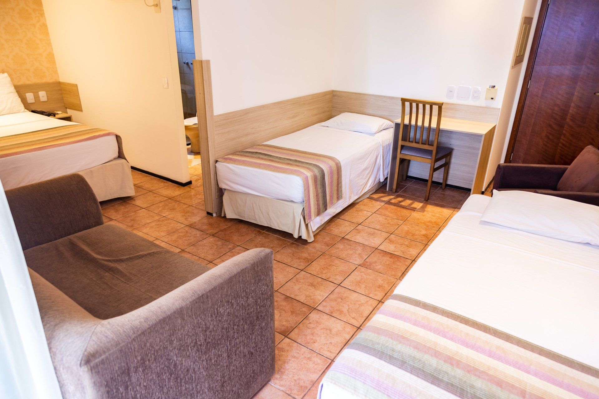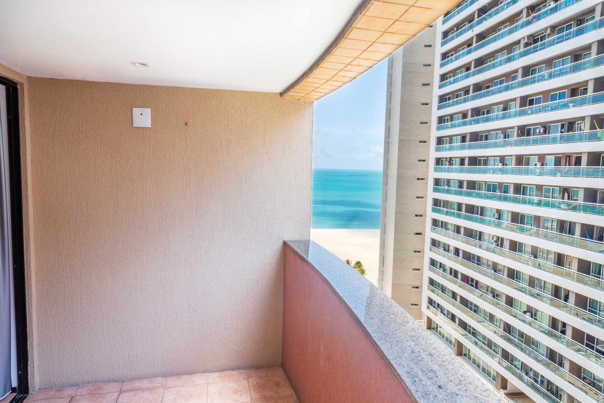 Suíte com área de 37m². Piso em cerâmica, vista parcial para o mar e varanda. Acomodação somente em cama de casal e um sofá cama ou uma cama de solteiro. Acomoda até três adultos.