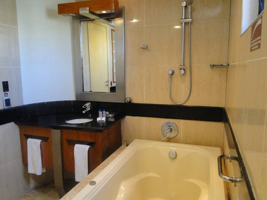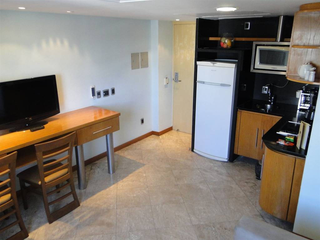 Suite com área de 65m2, dois ambientes, sendo o quarto com cama de casal, banheiro com banheira e sala com sofá cama e mini-cozinha integrada. Piso em granito. Acomoda casal com uma criança no sofá cama da sala.